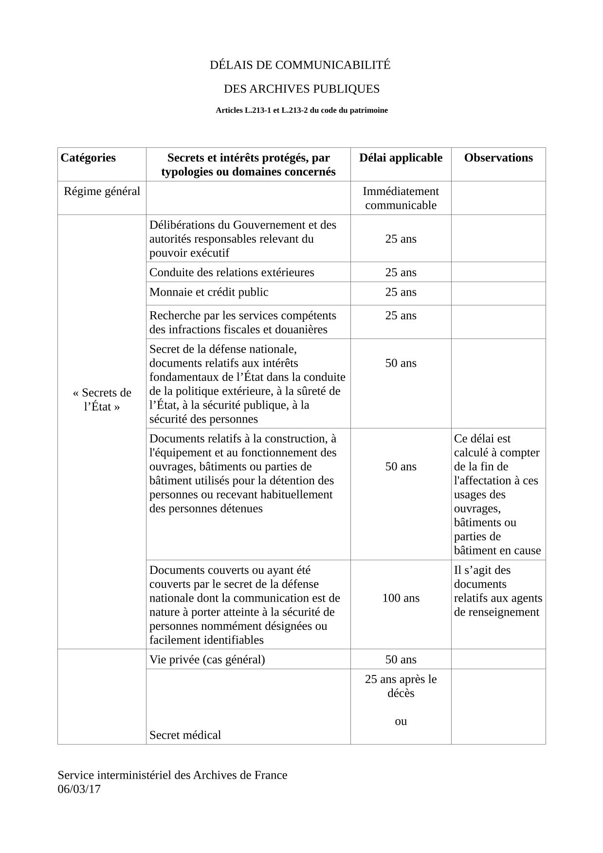 Quatre délais de communicabilité au public sont applicables dans le domaine des archives : 25 ans, 50 ans, 75 ans (état civil) et 100 ans.