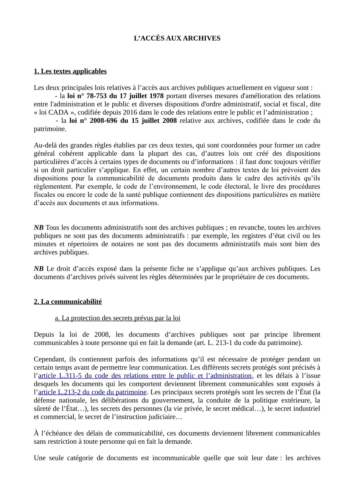 - D'autres lois sont aussi essentielles pour les archives comme la loi n°78-17 dite "informatique et libertés" ou la loi n°78-753 CADA "accès aux documents administratifs".